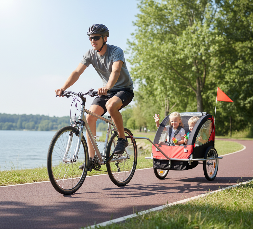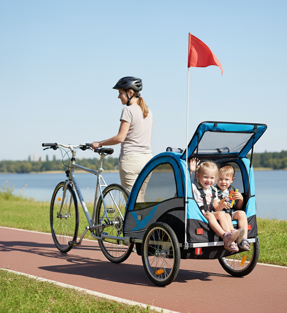 La remorque de vélo permet de transporter un ou deux enfants pendant les trajets à vélo. Le cadre en acier assure la stabilité, et le harnais à cinq points maintient les enfants en position sûre. Les fenêtres latérales transparentes et le fanion inclus améliorent la visibilité sur la route.